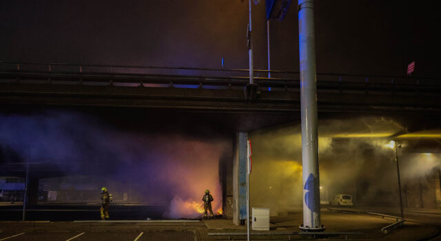 Autobanden in brand onder viaduct A20 Rotterdam veroorzaken dichte rook en ongeval