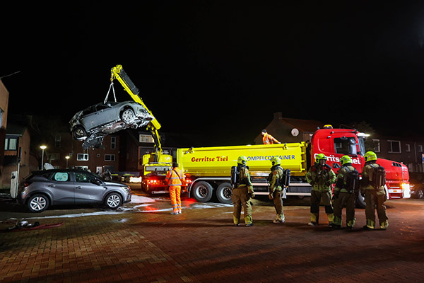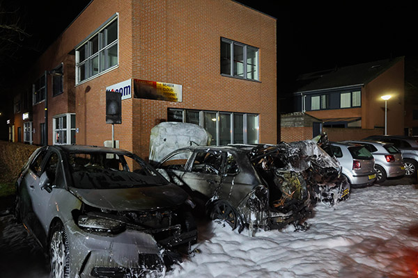 De brand was na ongeveer een uur onder controle. Een berger heeft ??n auto afgevoerd, terwijl twee voertuigen in een dompelcontainer zijn geplaatst om herontsteking te voorkomen. Er raakten geen gewonden.