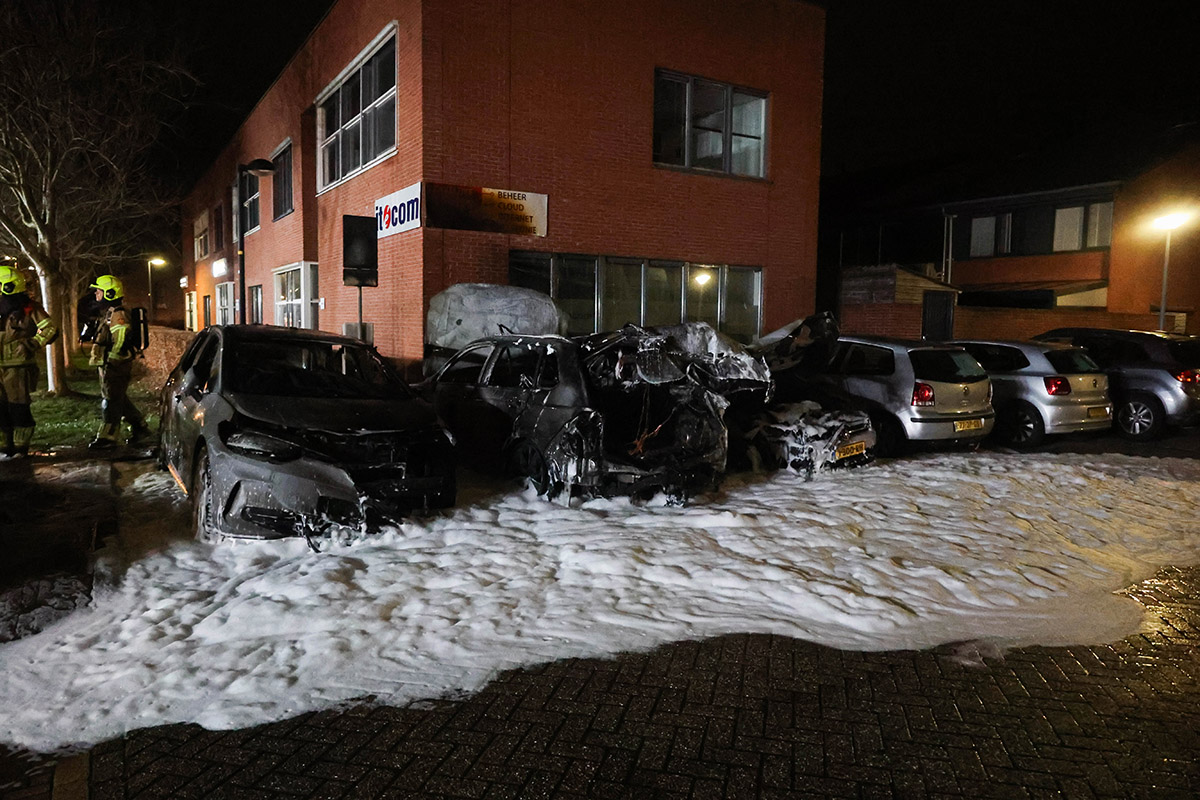 Alle drie de auto’s zijn volledig uitgebrand. Een vierde voertuig raakte licht beschadigd door de brand. Omdat de auto’s dicht tegen een bedrijfspand stonden, liep ook het pand schade op en sneuvelde een ruit.