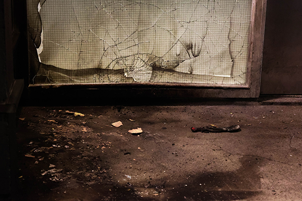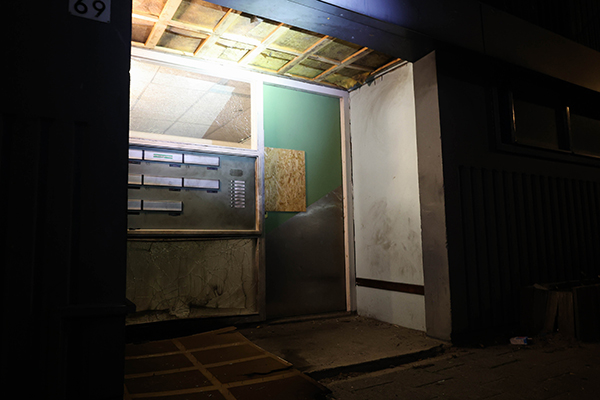 De explosie vond plaats bij de ingang van een portiek De schade is aanzienlijk: meerdere ruiten zijn gebarsten, de gevel is zwartgeblakerd en het plafond van de portiekingang is naar beneden gekomen.